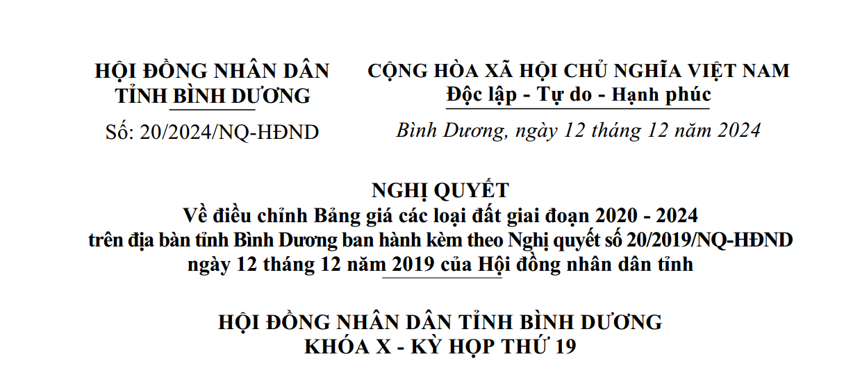 Ngày 12/12/2024, Hội đồng Nhân dân tỉnh Bình Dương đã thông qua Nghị quyết số 20/2024/NQ-HĐND Về điều chỉnh Bảng giá các loại đất giai đoạn 2020 - 2024 trên địa bàn tỉnh Bình Dương ban hành kèm theo Nghị quyết số 20/2019/NQ- HĐND ngày 12 tháng 12 năm 2019 của Hội đồng nhân dân tỉnh.
