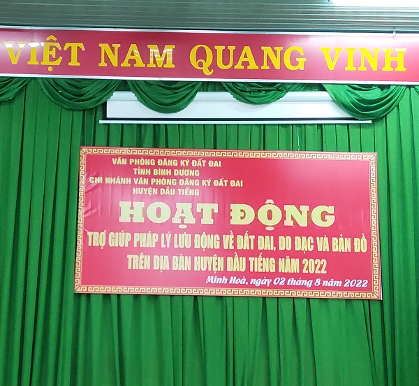 Tiếp tục chương trình hoạt động trợ giúp pháp lý về đất đai, Ngày 02/8/2022, Văn phòng đăng ký đất đai (VPĐKĐĐ) triển khai hoạt động Trợ giúp pháp lý trong lĩnh vực đất đai năm 2022 cho người dân, tổ chức trên địa bàn huyện Dầu Tiếng.