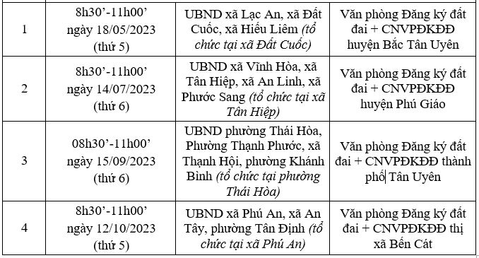 Tiếp tục sự thiết thực và đáp ứng kịp thời nhu cầu, nguyên vọng chính đáng của các hộ gia đình, cá nhân trong việc giải quyết các khó khăn vướng mắc về đất đai. Ngày 14/02/2023, VPĐKĐĐ đã ban hành kế hoạch số 44/KH-VPĐKĐĐ về việc triển khai hoạt động trợ giúp pháp lý lưu động năm 2023, tiếp nhận hồ sơ đăng ký cấp giấy chứng nhận và đo đạc bản đồ thuộc thẩm quyền của Sở Tài nguyên và Môi trường cho các hộ gia đình, cá nhân trên địa bàn 12 xã, phường, thị trấn thuộc 04 huyện, thị xã, thành phố.