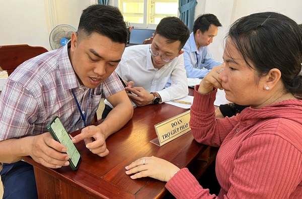 Trong xu hướng cả tỉnh quyết tâm triển khai các tiện ích dịch vụ công trực tuyến, hướng tới ba không như đồng chí Bí thư tỉnh ủy đã nhắc đến, Đoàn Trợ giúp pháp lý đã chủ động tích cực triển khai thêm hoạt động hướng dẫn người dân tự đăng ký thực hiện dịch vụ công trực tuyến lồng ghép chung với việc giải quyết các khó khăn vướng mắc của người dân. Tại đây, Đoàn Trợ giúp pháp lý đã thực hiện 2 hình thức đó là hình thức trình chiếu trên sân khấu hướng dẫn toàn thể người dân bằng 01 tài khoản cá nhân cụ thể từ bước bắt đầu đăng ký tên tài khoản đến bước cuối cùng là nộp hồ sơ (lồng ghép với việc tiệp nhận thành công 1 hồ sơ trực tuyến) và hình thức hướng dẫn trực tiếp tại bàn hướng dẫn cho cụ thể từng người dân có yêu cầu hỗ trợ. Qua đó, giúp cho người dân hiểu được cách thức thực hiện dịch vụ công trực tuyến khá đơn giản.