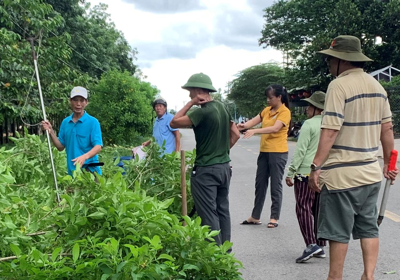 Ông Bùi Đức Kế (bìa trái) chung tay cùng người dân tham gia dọn vệ sinh môi trường