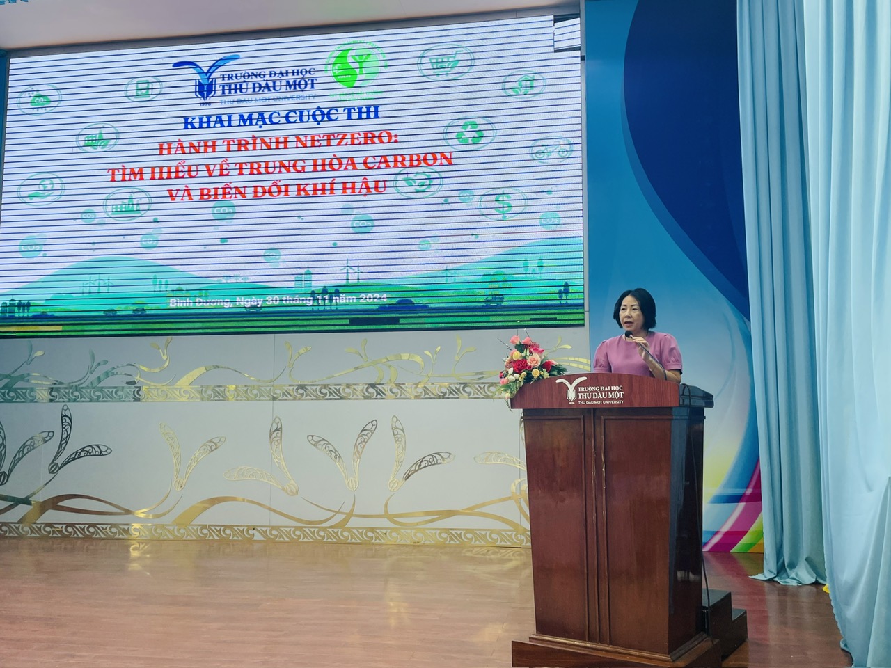 Sáng ngày 30/11/2024, tại Trường Đại học Thủ Dầu Một đã diễn ra buổi khai mạc Cuộc thi “Hành trình Net Zero: tìm hiểu về Trung hòa Carbon và Biến đổi khí hậu” . Toàn bộ kinh phí cuộc thi được Quỹ Bảo vệ môi trường tỉnh Bình Dương tài trợ với số tiền là 47 triệu đồng, bao gồm các hoạt động: