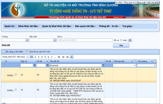 Cơ sở dữ liệu được quản lý, tra cứu khai thác trên phần mềm kho lưu trữ Sở TNMT