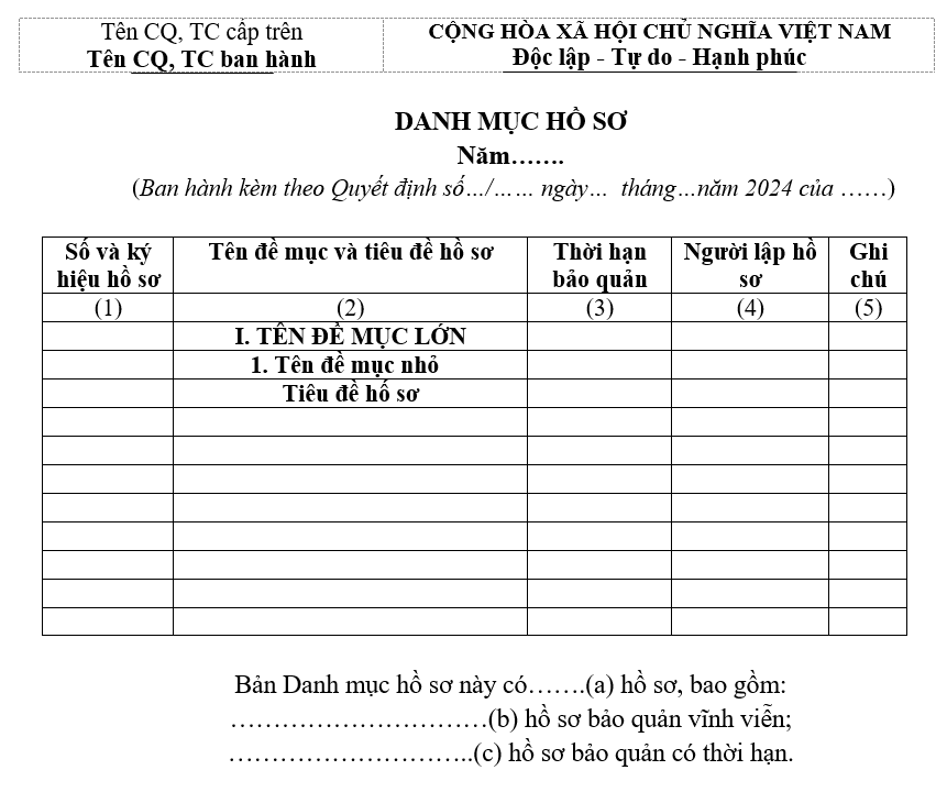 Có trách nhiệm hướng dẫn, đôn đốc, nhắc nhở việc lập Danh mục hồ sơ năm 2024 tại các phòng và đơn vị thuộc Sở, tổng hợp báo cáo kết quả thực hiện cho Giám đốc Sở theo quy định, mẫu Danh mục hồ sơ cụ thể như sau: