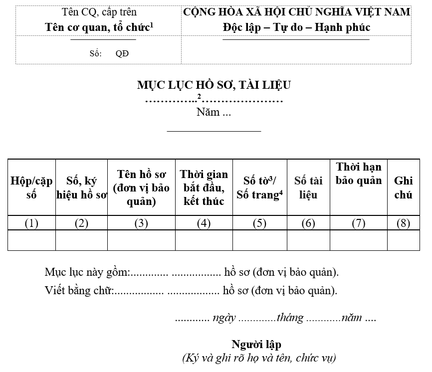 Chịu trách nhiệm lập Mục lục hồ sơ năm 2023 của đơn vị, tổ chức mình trước ngày 05/02/2024, theo mẫu sau: