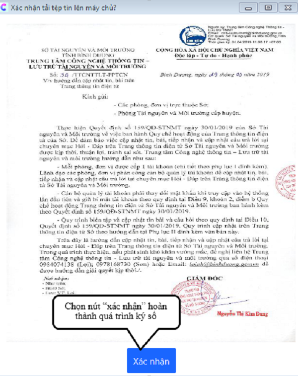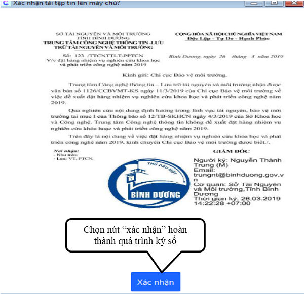 - Thao tác ký số đã hoàn tất, văn thư chọn nút “xác nhận” theo hình dưới để hoàn thành quá trình ký số
