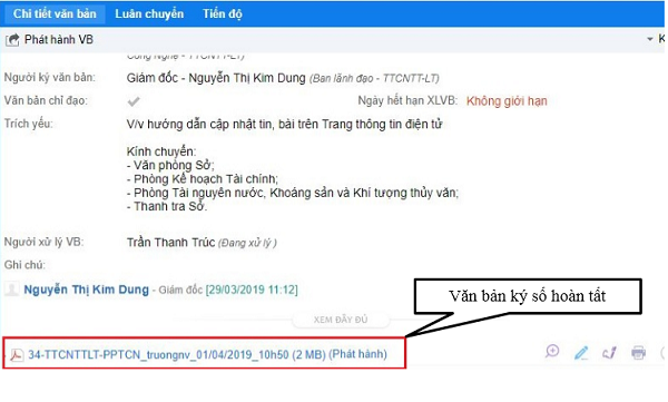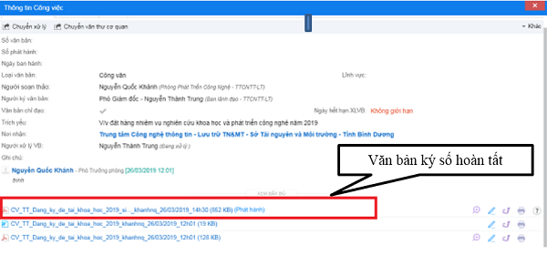 - Sau khi ký số hoàn tất, văn bản điện tử đã được ký số tự động đính kèm vào phần mềm quản lý văn bản như hình:
