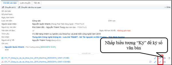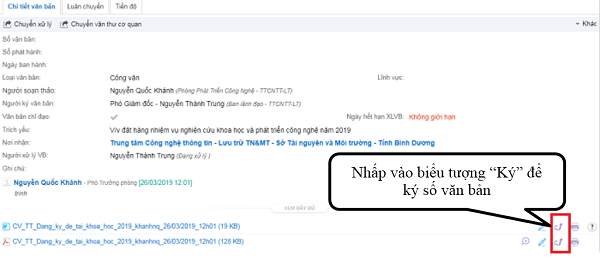 Nhấp vào biểu tượng “Ký” trên file đính kèm như hình dưới để ký số văn bản