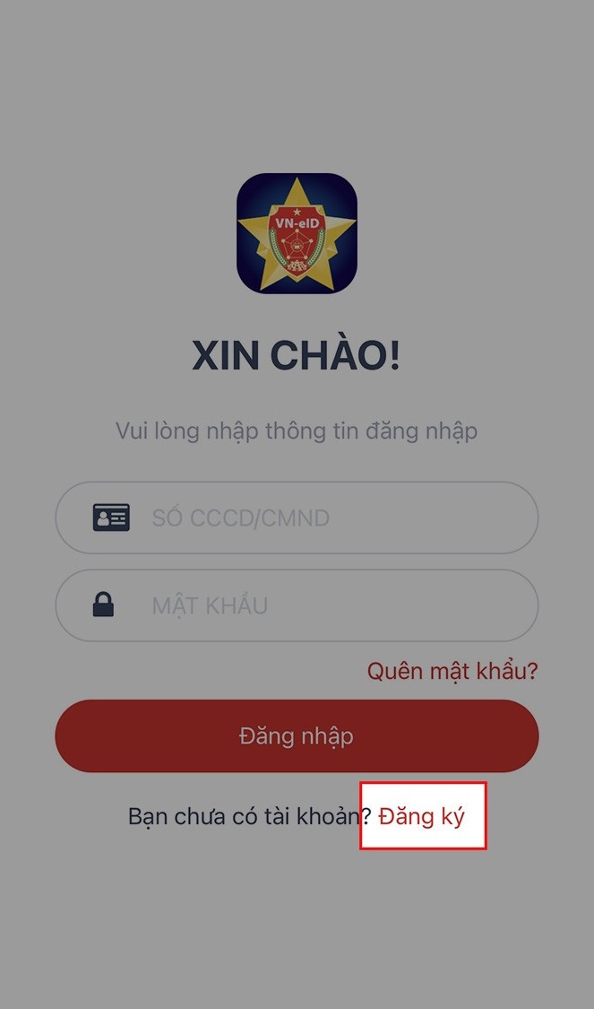 Sau khi đã cài đặt xong ứng dụng, bạn mở app VNEID lên và tiến hành đăng ký tài khoản bằng cách chọn Đăng ký. Người dùng cần đăng ký tài khoản với thông tin là số điện thoại đang sử dụng cùng số CMND hoặc CCCD mới.