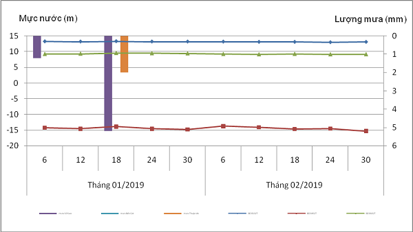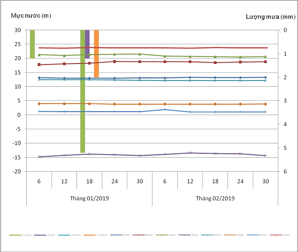 Mực nước bình quân tháng 02/2019 trong tầng MZ giảm nhẹ từ 0,23 m đến 0,25 m. Mực nước bình quân trong tầng tăng so với cùng kỳ các năm trước, mực nước trong tầng có xu thế tăng.