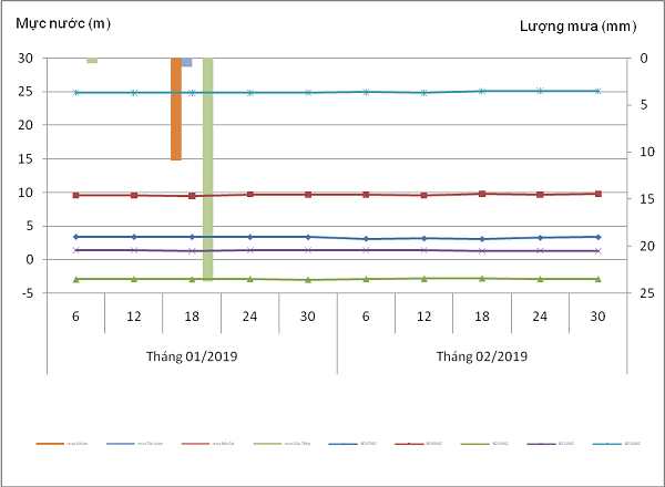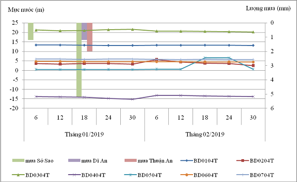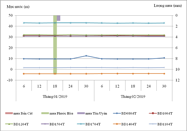 Tháng 02 năm 2019, mực nước trong tầng giảm nhẹ do lượng mưa bổ cập ít từ đầu mùa, mực nước trong tầng tại các công trình quan trắc tháng 02 giảm ,mực nước giảm từ 0,04 m đến 0,22 m so với tháng 01; trong đó khu vực An Tây có mực nước giảm lớn nhất 0,22 m. So với cùng kỳ năm 2018, mực nước trong tầng có xu hướng tăng nhẹ từ 0,00 m đến 0,07 m.