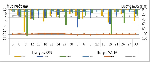 So với cùng kỳ năm 2018, mực nước nhỏ nhất thấp hơn 19 cm, mực nước lớn nhất thấp hơn 21 cm và mực nước bình quân thấp hơn 22 cm so với tháng 07/2018.