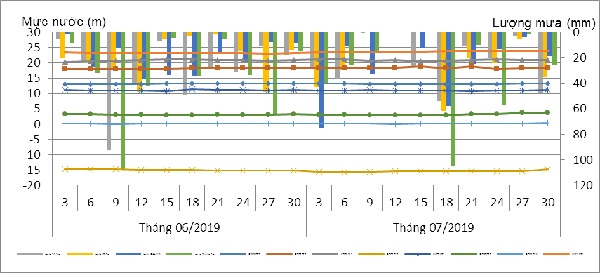Mực nước bình quân trên toàn tỉnh có xu thế chung là giảm (trung bình giảm 0,16 m) so với tháng 6 và giảm (0,64 m) so với cùng kỳ năm 2018. Tuy nhiên, mực nước bình quân trong tất cả các tầng có xu thế tăng so với cùng kỳ 02 năm trước và 05 năm trước.