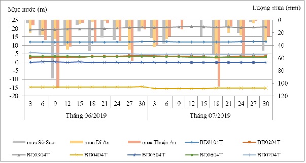 Tháng 07 năm 2019 là tháng mùa mưa, tuy nhiên, mực nước dưới đất trong tầng giảm so với tháng 6, mực nước giảm từ 0,08 m đến 0,51 m. Mực nước giảm mạnh nhất 0,51 m ở khu vực Vĩnh Phú, khu vực Phú Hòa mực nước tăng nhẹ 0,04 m.