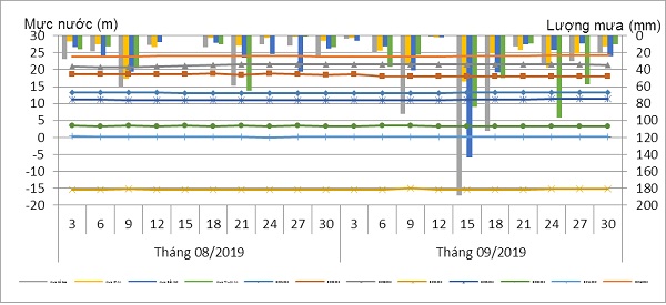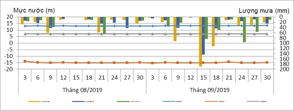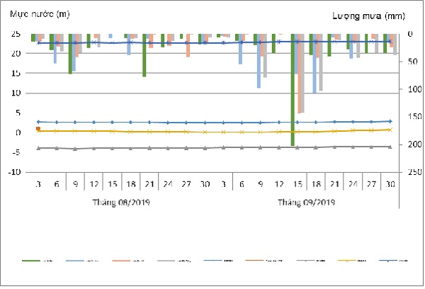 - Tháng 09 năm 2019 mực nước giảm từ 0,04 m đến 0,44 m so với tháng 8. So với cùng kỳ năm 2018 và 2017, mực nước trong tầng có xu hướng giảm, riêng ở khu vực Phú Hòa mực nước tăng 0,25 m.