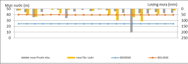 Hình 6: Biểu đồ tích lũy lượng mưa trung bình và mực nước tầng Pliocen giữa