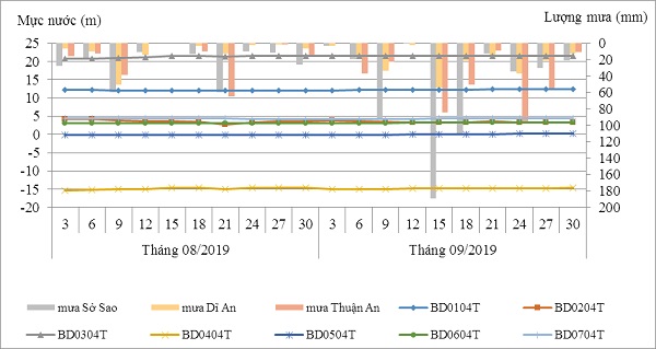 Mực nước bình quân trong tầng tháng 09 giảm từ 0,04 m đến 0,65 m; trong đó khu vực An Phú giảm mạnh nhất 0,65 m so với tháng 08, riêng khu vực Sóng Thần tăng 0,23 m.