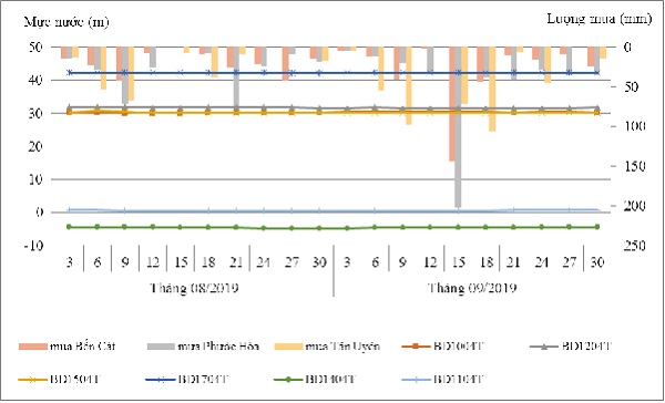 Tháng 09 là tháng gần cuối mùa mưa, lượng mưa diễn ra tương đối đồng đều, mưa nhiều nhất tập trung ở các điểm Dầu Tiếng và Sở Sao, mực nước trung bình trong các tầng giảm 0,10 m so với tháng 08, so với cùng kỳ năm 2018 mực nước có xu thế giảm (giảm 1,07 m). So với cùng kỳ 02 và 05 năm trước, mực nước trong tầng có xu hướng giảm.