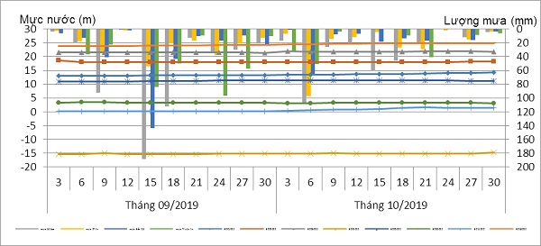 Tháng 10 năm 2019 là tháng mùa mưa, lượng nước dưới đất bắt đầu có sự thay đổi do lượng nước được thẩm thấu nhiều nên mực nước trong các tầng tăng từ 0,85 m đến 1,59 m. Tuy nhiên, khu vực An Tây mực nước giảm 0,20m.