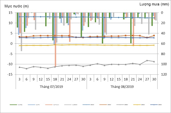 So với cùng kỳ năm 2018 mực nước bình quân trong tầng Pleistocen dưới có xu thế giảm từ 0,20 m đến 0,89 m và so với cùng kỳ 02 năm và 05 năm trước mực nước trong tầng có xu hướng tăng.
