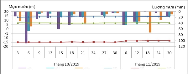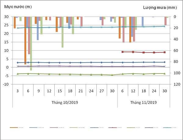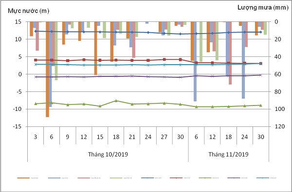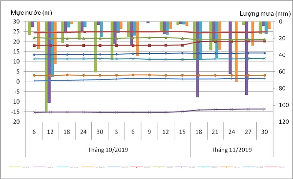 Tháng 11 năm 2019 là tháng mùa khô, tuy nhiên lượng mưa trong tháng vẫn lớn, lượng nước mưa từ các tháng trước vẫn đang trong quá trình thẩm thấu bổ sung nước cho các tầng chứa nước phía trên, do đó mực nước dưới đất tại các tầng trên tăng so với tháng 10, các tầng sâu bao gồm Pliocen giữa, Pliocen dưới và Jura có xu hướng giảm.