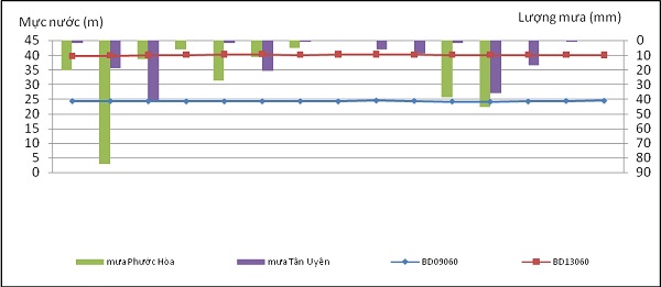 Hình 6: Biểu đồ tích lũy lượng mưa trung bình và mực nước tầng Pliocen giữa