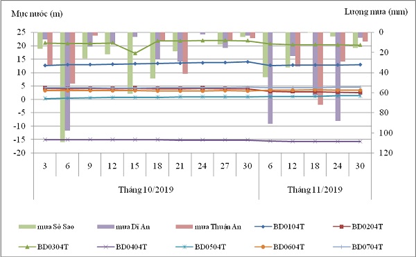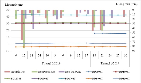 Tháng 11 năm 2019 là tháng mùa khô, tuy nhiên lượng mưa vẫn còn nhiều, tại khu vực Dĩ An có lượng mưa trong tháng là 270,8 mm và lượng nước mưa từ các tháng trước vẫn đang trong quá trình thẩm thấu xuống dưới bổ sung nước cho nguồn nước dưới đất, do đó mực nước dưới đất tại các tầng tăng so với tháng 10. Riêng các tầng sâu bao gồm Pliocen giữa, Pliocen dưới và Jura có xu hướng giảm.
