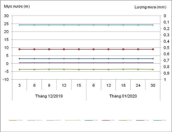 Mực nước bình quân tháng 01/2020 tầng MZ tăng từ 0,02 m đến 0,05 m. So với cùng kỳ 2019 mực nước bình quân có xu thế giảm từu 0,07 m đến 0,50 m , so với cùng kỳ 2 năm và 5 năm trước mực nước bình quân tăng giảm không đồng đều.