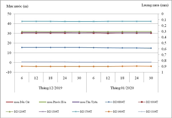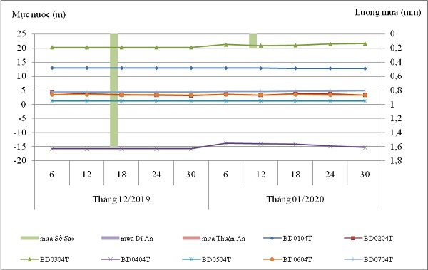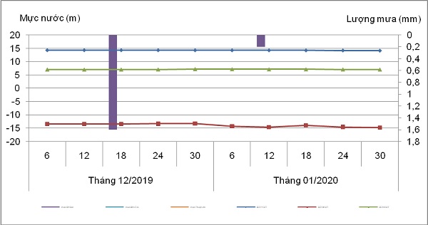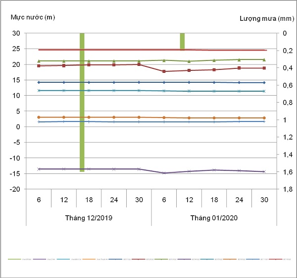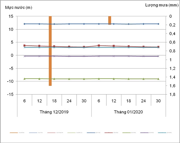 Tháng 01 năm 2020 là tháng mùa khô, các khu vực hầu như không có mưa, mực nước bình quân trong các tầng giảm 0,05 m so với tháng 12/2019. Mực nước giảm 0,17 m so với tháng 12/2018, tuy nhiên so với cùng kỳ 5 năm mực nước tăng 0,89m. Tháng 02, dự báo mực nước dưới đất sẽ giảm song không nhiều do còn các cơn mưa trái mùa với cường độ lớn vẫn tiếp tục xảy ra trên diện rộng.