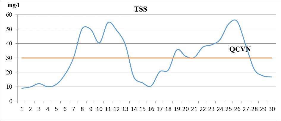 Kết quả quan trắc cho thấy thông số pH dao động ổn định, bình quân 7,6 và đạt QCVN08-MT:2015/BTNMT (cột A2); Nhiệt độ nước bình quân 31,1°C. TSS dao động mạnh từ 8,9 mg/l đến 55,3 mg/l, bình quân 29,5 mg/l, tăng 1,8 lần so với tháng 03/2021, một số thời điểm vượt quy chuẩn vào giữa tháng và cuối tháng;
