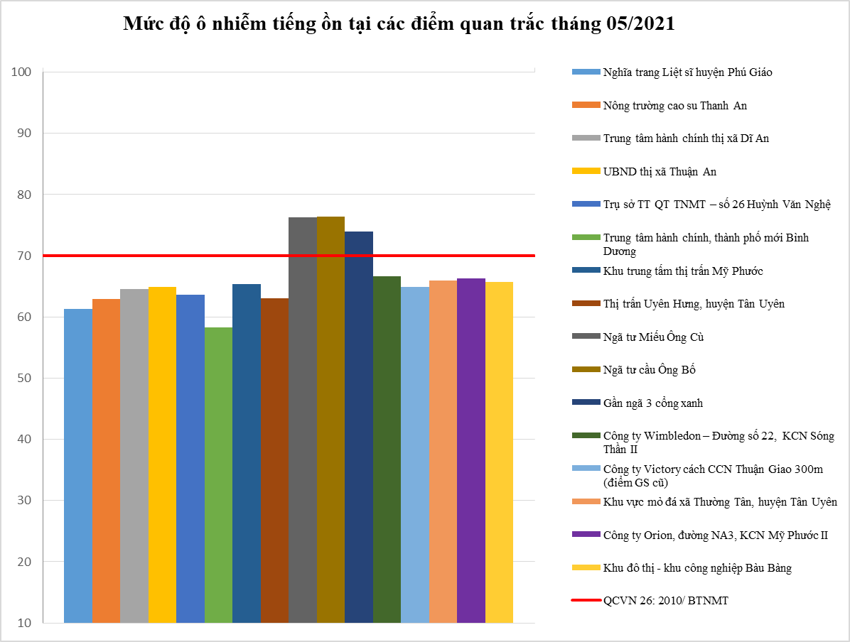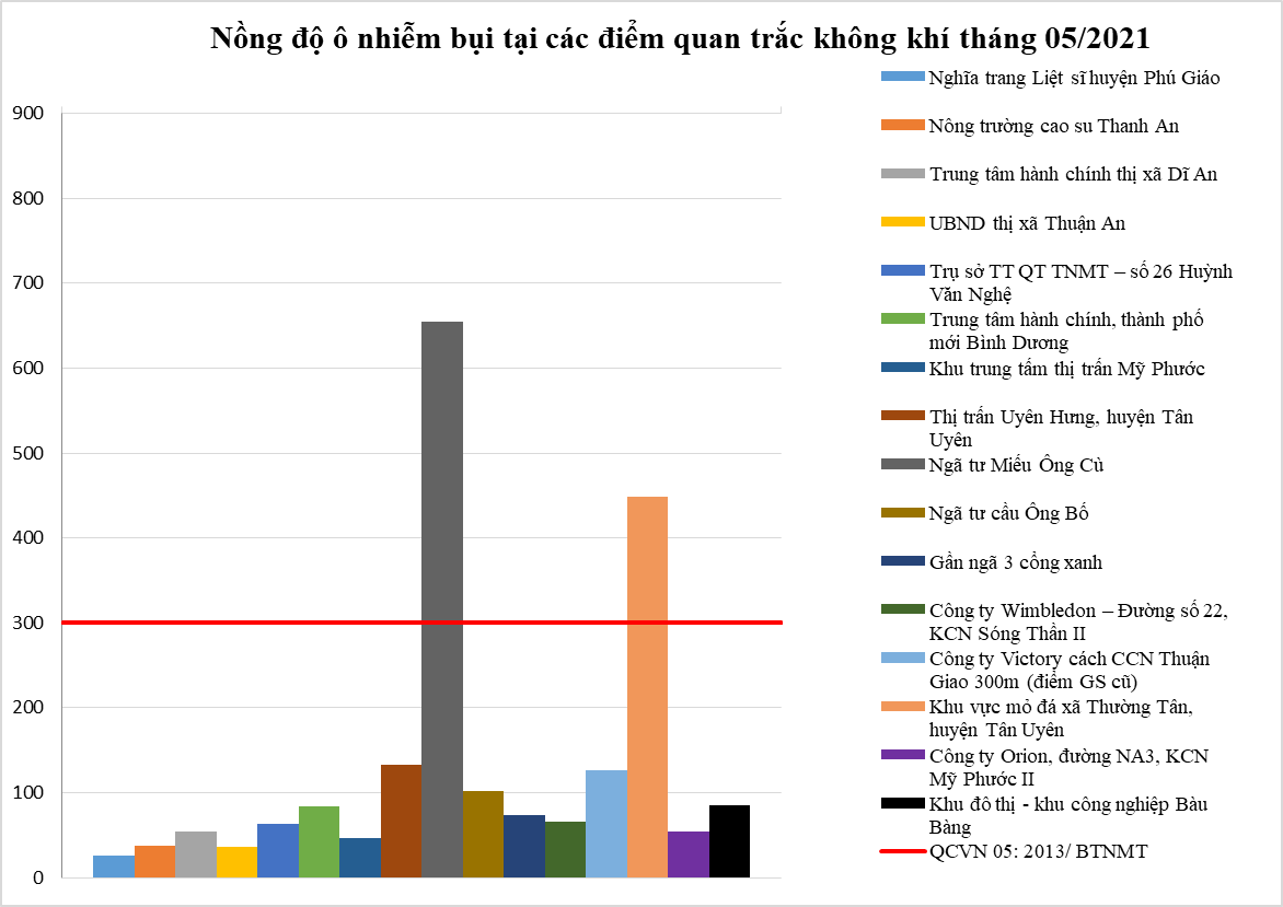 Kết quả quan trắc không khí tháng 05/2021 cho thấy nồng độ các thông số quan trắc CO, NO2, SO2, O3, bụi chì, bụi PM10, benzen, xylen, toluene tại hầu hết các điểm quan trắc đều dưới ngưỡng tiêu chuẩn cho phép. Bụi tổng đạt tiêu chuẩn ở hầu hết các vị trí quan trắc trừ 2 vị trí: ngã tư miếu Ông Cù (GT1) bụi tổng vượt 2,2 lần và bụi PM10 vượt 1,1 lần; vị trí khu vực mỏ đá xã Thường Tân, huyện Tân Uyên (CN3) bụi tổng vượt 1,5 lần so với QCVN 05: 2013/BTNMT. Tiếng ồn đạt tiêu chuẩn cho phép ở hầu hết các vị trí quan trắc, vượt ở các vị trí giao thông: GT1 vượt 6,3 dB(A), ở vị trí GT2 vượt 6,4 dB(A), ở vị trí GT3 vượt 4,0 dB(A) so với QCVN 26:2010/BTNMT. Thông số benzen vượt tại vị trí ngã tư miếu Ông Cù (GT1) vượt 1,7 lần so với QCVN 06:2009/ BTNMT.