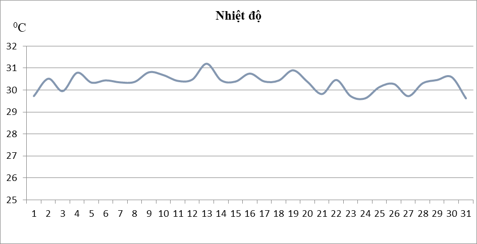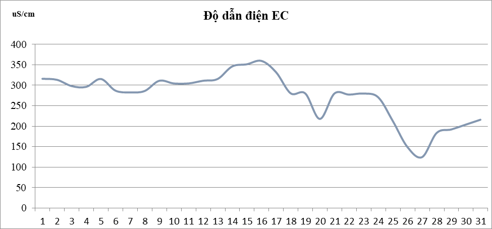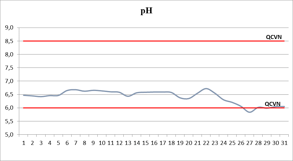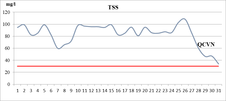 Kết quả quan trắc cho thấy pH dao động từ 5,8 đến 6,7; Chỉ tiêu TSS biến động không nhiều, bình quân 83,6 mg/l, có xu hướng giảm mạnh vào các ngày cuối tháng; DO dao động ở mức rất thấp, bình quân 1,25 mg/l; Độ dẫn điện bình quân tháng là 274 µS/cm; Nhiệt độ nước bình quân 30,3°C;