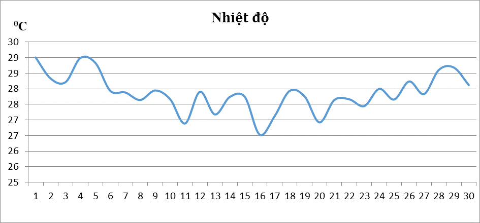 Qua kết quả quan trắc cho thấy, chỉ tiêu nhiệt độ dao động từ 26,5 đến 29,0oC; chỉ tiêu Nitrat dao động ổn định từ 6,5 đến 8,4 mg/l, bình quân tháng là 7,2mg/l; chỉ tiêu DO dao động ổn định từ 5,1 đến 6,0 mg/l, trung bình đạt 5,4 mg/l; độ dẫn điện dao động ổn định từ 66 đến 86 µS/cm, bình quân là 70 µS