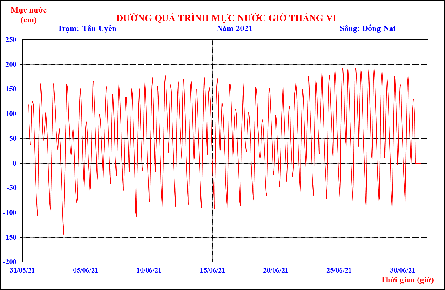 Mực nước trung bình tháng 6 năm 2021 trên sông Đồng Nai tại trạm Tân Uyên là 59cm, thấp hơn 16 cm so với tháng 5/2021.