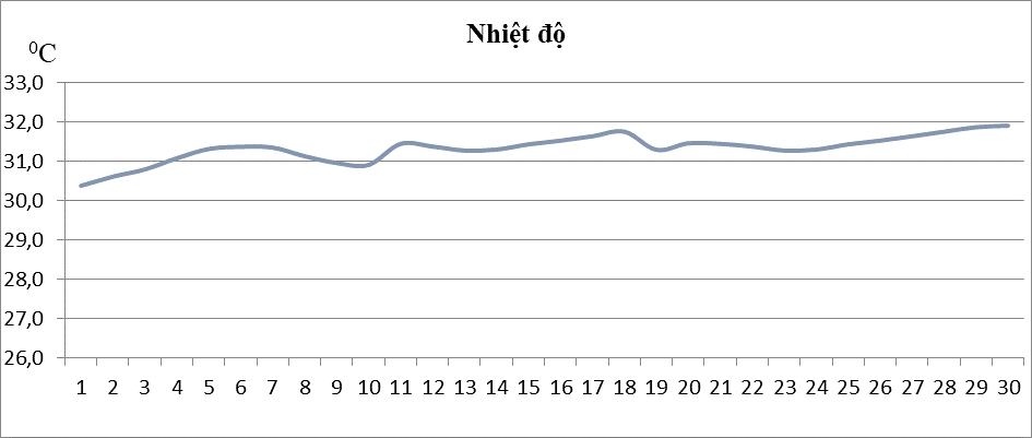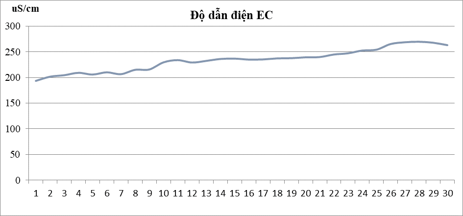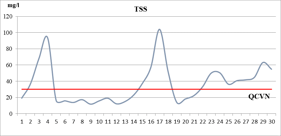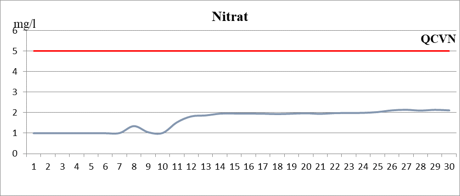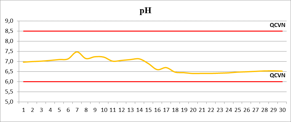Các thông số pH, Nitrat dao động ổn định và đều đạt QCVN08-MT:2015/BTNMT (cột A2); pH dao động từ 6,4 đến 7,5, bình quân 6,8. Chỉ tiêu TSS dao động từ 11,9 mg/l đến 104,3 mg/l, bình quân 36,7 mg/l; Chỉ tiêu Nitrat bình quân 1,67 mg/l; Độ dẫn điện dao động từ 193 đến 269 µS/cm, bình quân tháng là 234 µS/cm; Nhiệt độ nước bình quân 31,3°C;