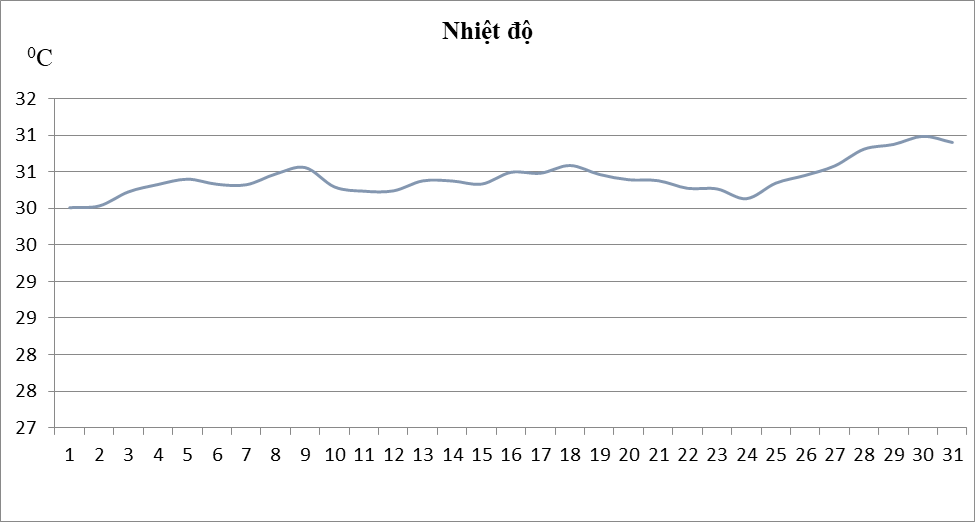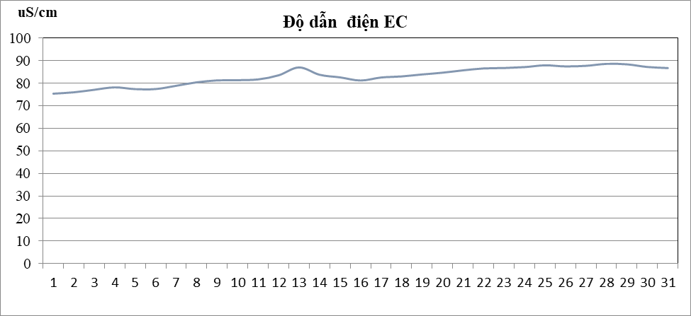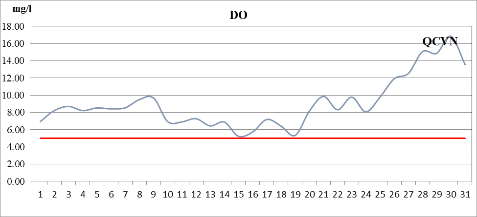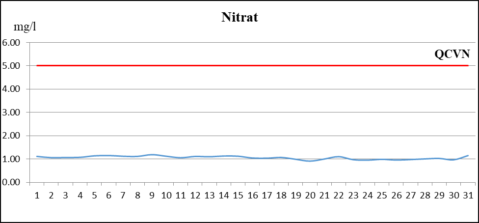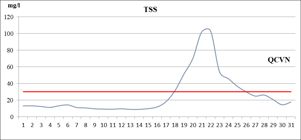 Kết quả quan trắc cho thấy thông số pH dao động ổn định, bình quân 6,5 và đạt QCVN08-MT:2015/BTNMT (cột A2); Nhiệt độ nước bình quân 30,4°C. TSS dao động mạnh từ 8 mg/l đến 128 mg/l, bình quân 27 mg/l; Chỉ tiêu Nitrat bình quân là 1,1 mg/l nhỏ hơn QCVN.