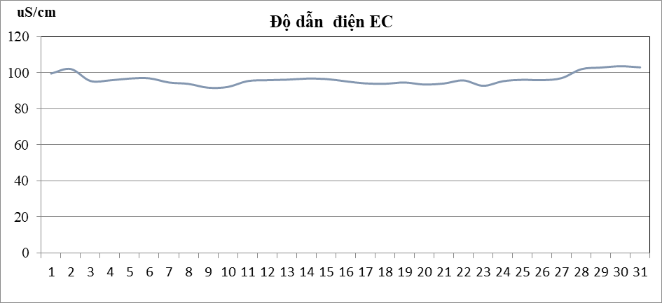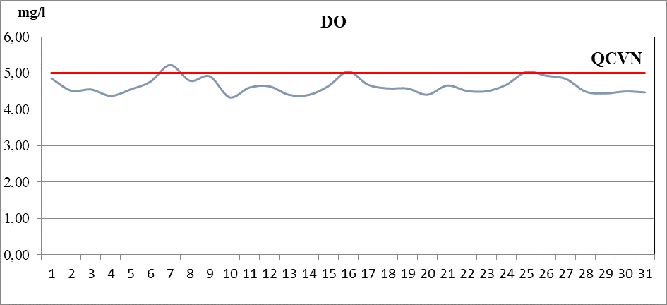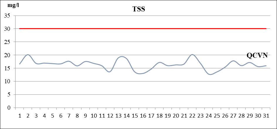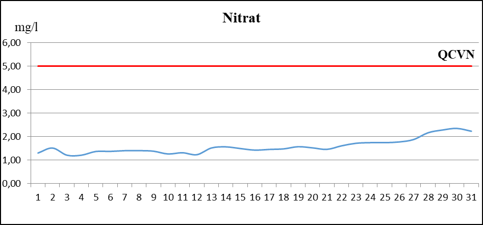 Kết quả quan trắc cho thấy thông số pH dao động ổn định, bình quân 6,4 và đạt QCVN08-MT:2015/BTNMT (cột A2); Nhiệt độ nước bình quân 30, 5°C. TSS dao động mạnh từ 12,7 mg/l đến 20,2 mg/l, bình quân 16,4 mg/l; Chỉ tiêu Nitrat bình quân là 1,5 mg/l nhỏ hơn QCVN.