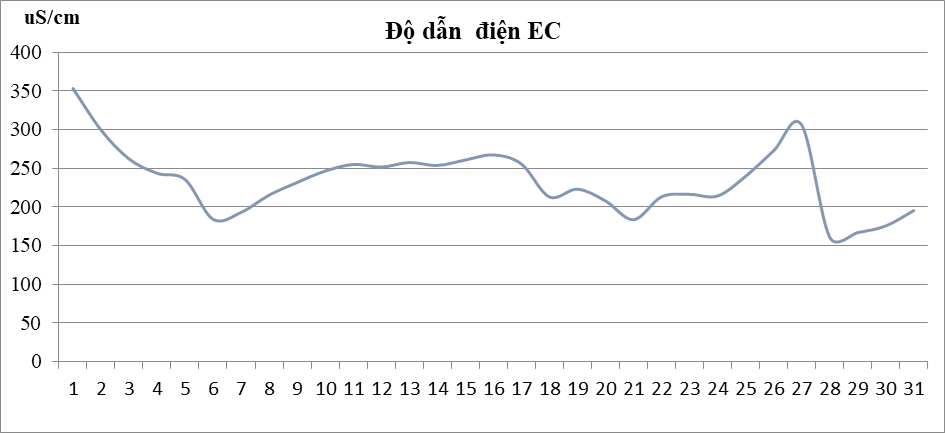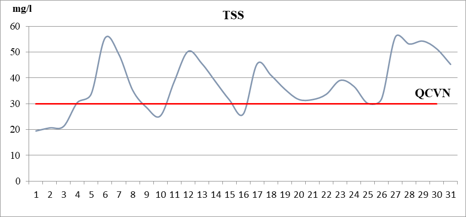 Kết quả quan trắc cho thấy pH dao động từ 5,1 đến 5,9 và bình quân tháng là 5,6 thấp hơn QCVN; Chỉ tiêu TSS biến động không nhiều, dao động từ 19,4 đến 55,7mg/l, bình quân 37,3 mg/l và đạt quy chuẩn cho phép; Chỉ tiêu Nitrat bình quân đạt 0,12 mg/l và đạt quy chuẩn cho phép.