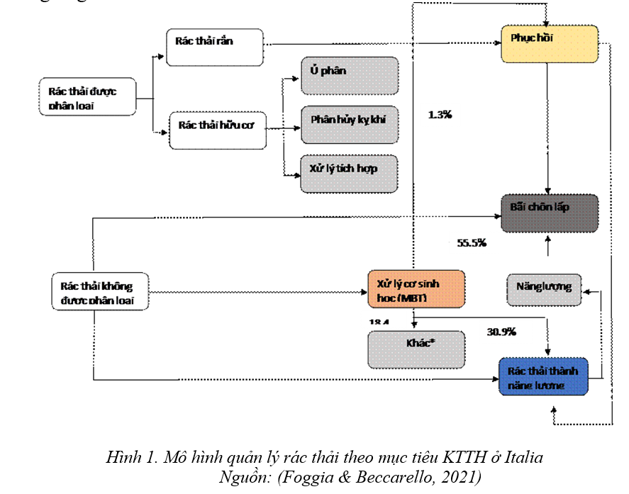 Tổng quan về mô hình QLRT theo mục tiêu KTTH ở Italia, được thể hiện ở Hình 1, với hai quá trình xử lý rác thải đã được phân loại và rác thải chưa được phân loại. Đồng thời, mức chi phí của từng giai đoạn liên quan đến tổng chi phí dịch vụ quản lý chất thải và điểm đến của rác thải được xử lý trong các cơ sở xử lý cơ sinh học (MTB) cũng được thể hiện. Theo đó, 55,5% rác thải xử lý trong các cơ sở MBT được đưa đến bãi chôn lấp, 30,9% được chuyển đến các nhà máy chuyển rác thải thành năng lượng và 18,4% đến các cơ sở khác; chỉ 1,3% được gửi đến các cơ sở thu hồi và tái chế. Điểm mạnh của mô hình này là việc sử dụng công nghệ xử lý cơ sinh học (MBT) tại các nhà máy để xử lý rác thải chưa được phân loại từ rác thải đô thị đến rác thải đặc biệt, thể hiện một bước tiến lớn trong việc xuất khẩu rác được sản xuất từ vùng này sang vùng khác từ đó giúp tối đa hóa được những lợi ích thiết yếu từ những lợi ích tổng thể về môi trường và sinh thái, hạn chế các tác động tiêu cực so với trước đó.