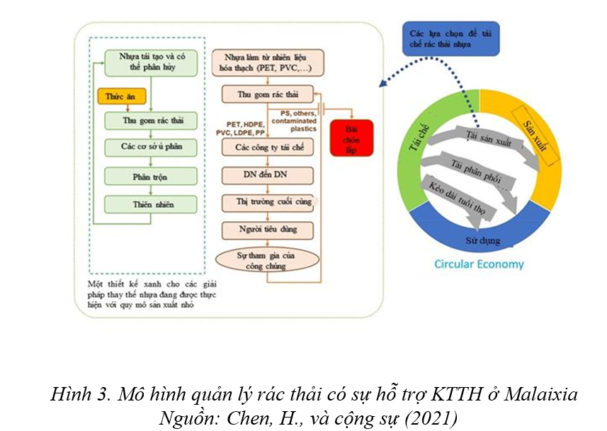 Malaixia: Tại nước này, hầu hết các công ty tái chế nhựa sẽ lựa chọn nhựa tái chế nhập khẩu so với nhựa tái chế trong nước do giá thấp hơn, khối lượng lớn, chất lượng đồng nhất và nguồn cung đảm bảo. Chuỗi cung ứng yếu và mỏng manh cũng như thiếu thị trường hoạt động tốt cho nhựa tái chế là thách thức lớn nhất mà các nhà tái chế nhựa trong nước phải đối mặt. Do đó, để thúc đẩy các ngành công nghiệp tái chế và khả năng cạnh tranh trên thị trường, năm 2021, một mô hình QLRT nhựa theo KTTH đã được áp dụng và có thể xem đây là giải pháp tối ưu cho ngành công nghiệp nhựa ở Malaixia (Chen, H., và cộng sự, 2021).