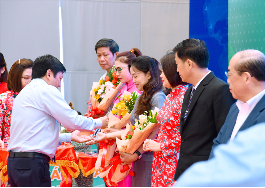 Ông Ngô Quang Sự - Giám đốc Sở Tài nguyên và Môi trường tặng hoa và kỷ niệm chương cho 10 doanh nghiệp thực hiện tốt công tác bảo vệ môi trường