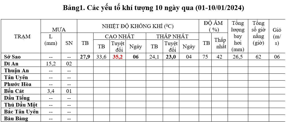 Tuần qua, tổng lượng mưa ở các nơi phổ biến xấp xỉ và thấp hơn so với TBNN từ 2 – 4mm, riêng Dĩ An cao hơn TBNN 14,2mm.  Độ ẩm không khí trung bình 75% thấp hơn TBNN 5%, độ ẩm thấp nhất 42 xảy ra ngày 06/1. Tổng lượng bay hơi: 26,5mm thấp hơn TBNN 6,3mm. Tổng số giờ nắng: 62 giờ thấp hơn TBNN 23,9 giờ. Gió mạnh nhất 06m/s hướng Nam Đông Nam xảy ra ngày 02/1.