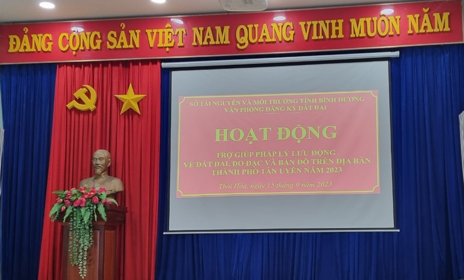 Sáng 15-9, Văn phòng Đăng ký đất đai phối hợp với Chi nhánh, Phòng Tài nguyên và Môi trường thành phố Tân Uyên và UBND phường Thái Hòa tổ chức hoạt động trợ giúp pháp lý lưu động về đất đai, hướng dẫn tự đăng ký thực hiện dịch vụ công trực tuyến cho người dân, tổ chức trên địa bàn phường Thái Hòa, phường Khánh Bình, phường Thạnh Phước, xã Thạnh Hội.