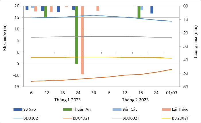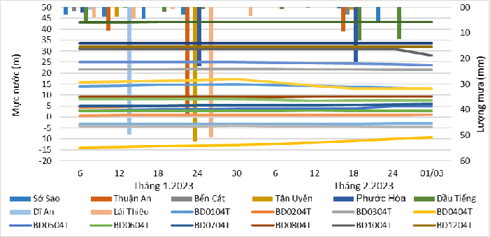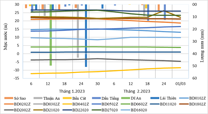 Nhận xét: Tháng 02 năm 2023 là tháng giữa mùa khô, mực nước bình quân trong các công trình quan trắc tháng 02 có tăng từ 0,03m đến 2,68m (khu vực Vĩnh Phú, An Tây), giảm 0,78m (khu vực Phú Hòa) so với tháng 1; So với cùng kỳ năm 2022, mực nước bình quân ở các khu vực có xu hướng tăng từ 0,23m đến 5,49m; So với cùng kỳ năm 2021 mực nước bình quân có xu hướng tăng từ 1,13m đến 6,03m; So với cùng kỳ năm 2018, ở khu vực Phú Hòa, Vĩnh Phú mực nước có xu hướng tăng từ 1,31m đến 5,15m, riêng mực nước tại khu vực An Tây có xu hướng giảm từ 2,54m.