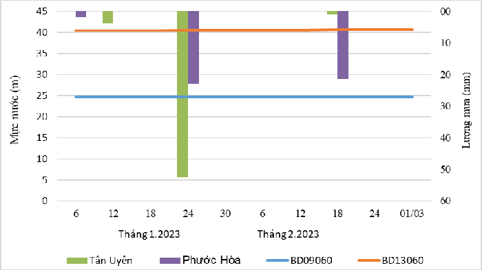 Nhận xét: Mực nước bình quân tháng 02 năm 2023 tầng MZ tại khu vực Tam Lập tăng nhẹ 0,14m, tại khu vực Lạc An giảm nhẹ 0,01m so với tháng 01; So với cùng kỳ 2022 mực nước bình quân tăng từ 0,82 đến 1,03m; So với cùng kỳ năm 2021, mực nước bình quân tăng 1,47 đến 1,71m; So với cùng kỳ năm 2018, mực nước bình quân tang từ 0,58 đến 0,67m.