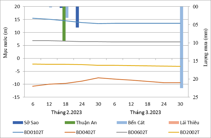 Nhận xét: Mực nước bình quân tháng 03 năm 2023 tầng MZ tăng nhẹ 0,09m đến 0,15m so với tháng 02; So với cùng kỳ 2022 mực nước bình quân tăng từ 0,64 đến 1,0m; So với cùng kỳ năm 2021, mực nước bình quân tăng 1,57 đến 1,81m; So với cùng kỳ năm 2018, mực nước bình quân tang từ 0,54 đến 1,09m.