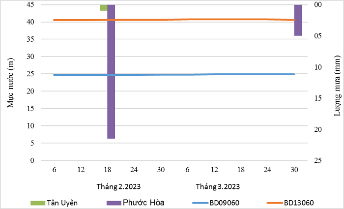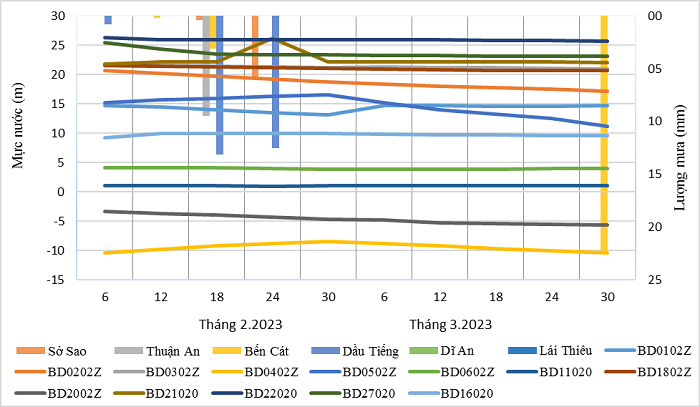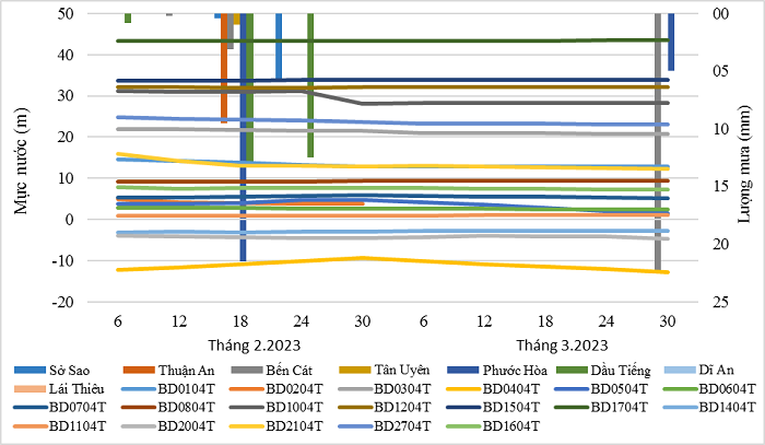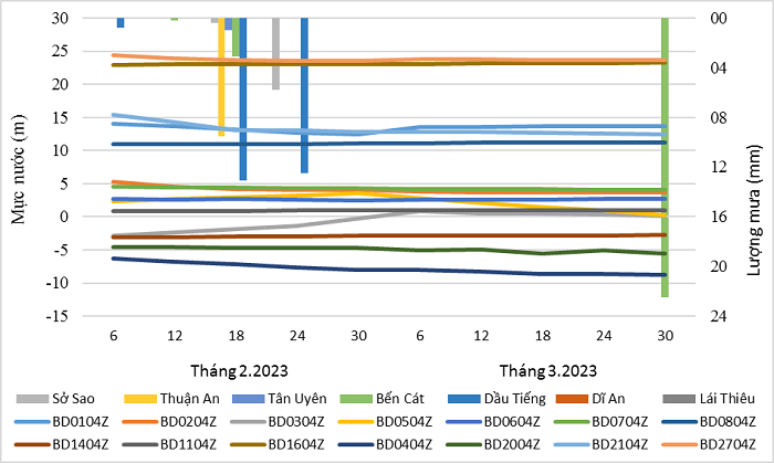 Nhận xét: Tháng 03 năm 2023 là tháng gần cuối mùa khô, mực nước bình quân trong các công trình quan trắc tháng 03 giảm từ 0,27m đến 0,94m, riêng khu vực Vĩnh Phú tăng 0,54m so với tháng 02; So với cùng kỳ năm 2022, mực nước bình quân ở các khu vực có xu hướng tăng từ 0,81m đến 5,87m, riêng khu vực An Tây giảm 0,12m; So với cùng kỳ năm 2021 mực nước bình quân có xu hướng tăng từ 1,08m đến 6,46m; So với cùng kỳ năm 2018, ở khu vực Phú Hòa, Vĩnh Phú mực nước có xu hướng tăng từ 0,37m đến 5,80m, riêng mực nước tại khu vực An Tây có xu hướng giảm từ 2,84m.