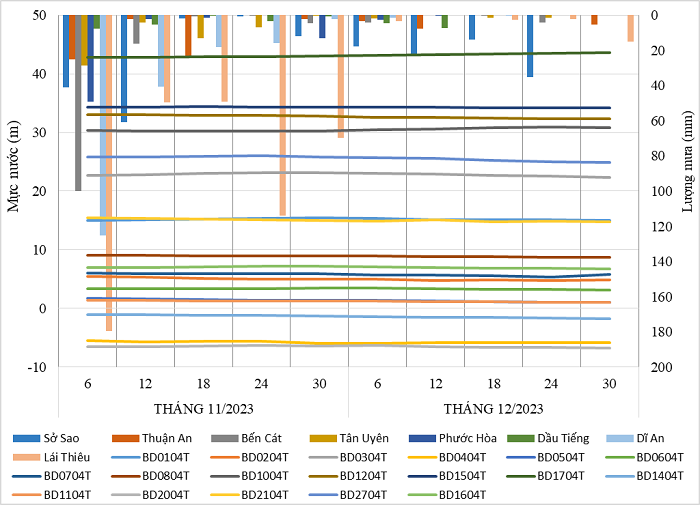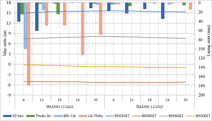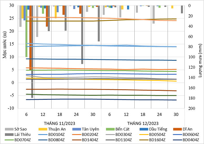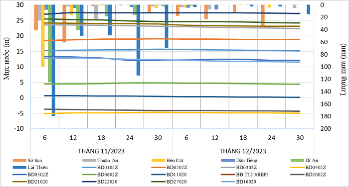 Kết luận: Tháng 12 năm 2023 là tháng thứ 02 mùa khô, với tổng lượng mưa trung bình là 20,2mm, giảm 4,56 lần so với tháng 11 (92,0mm). Mực nước bình quân trong tháng 12 có xu thế giảm do lượng nước mưa giảm mạnh dẫn đến nguồn bổ cập cho các tầng chứa nước giảm mạnh, do đó mực nước dưới đất ở hầu hết các khu vực có xu thế giảm hơn so với tháng 11.
