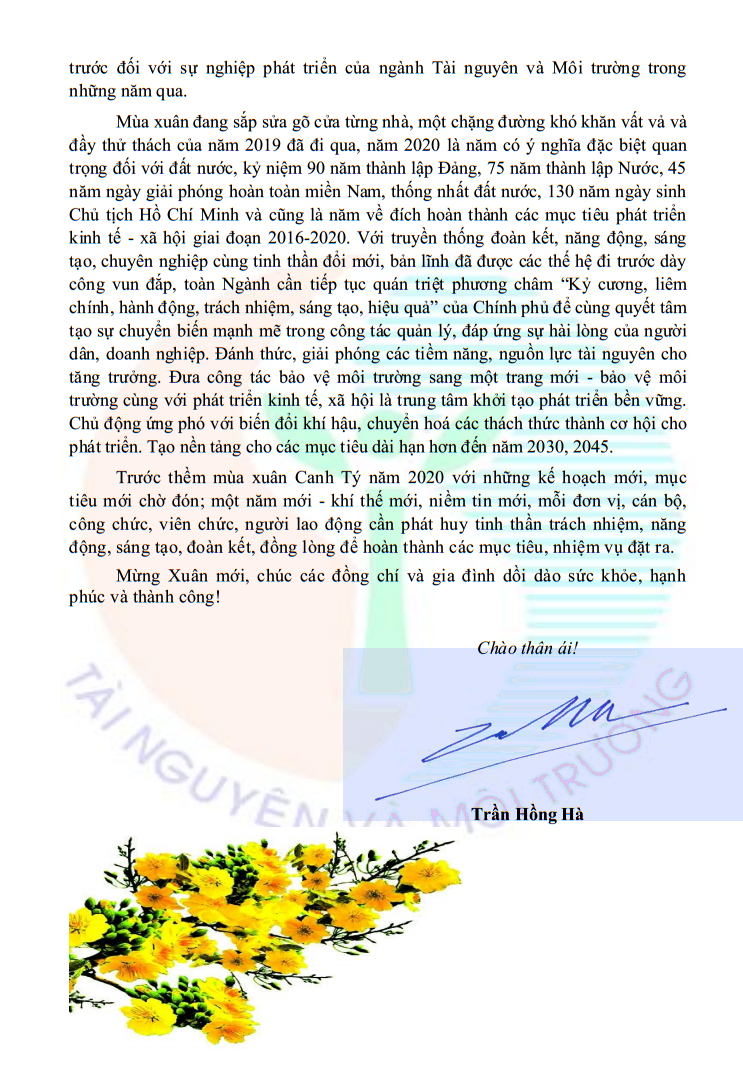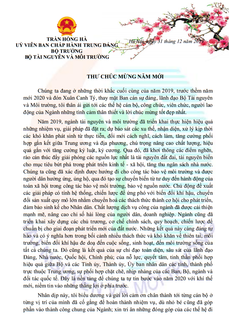 Trước thềm năm mới 2020 và đón Xuân Canh Tý, thay mặt Ban cán sự đảng, lãnh đạo Bộ Tài nguyên và Môi trường, Bộ trưởng Trần Hồng Hà thân ái gửi tới các thế hệ cán bộ, công chức, viên chức, người lao động của Ngành những tình cảm thân thiết và lời chúc mừng tốt đẹp nhất. Cổng thông tin điện tử Bộ Tài nguyên và Môi trường trân trọng đăng toàn văn bức thư.