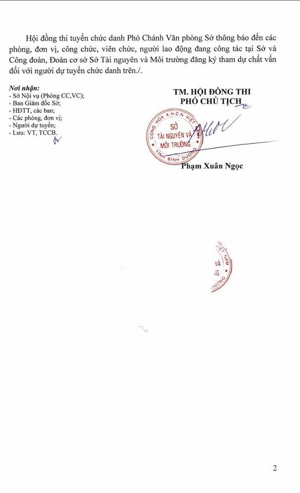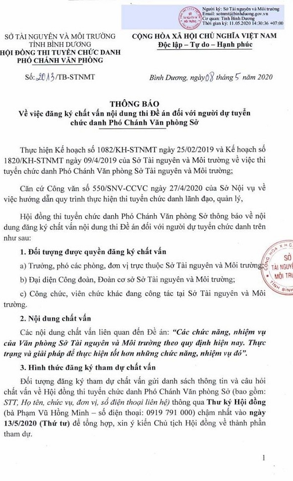 Hội đồng thi tuyển chức danh Phó Chánh Văn phòng Sở trân trọng thông báo đến các phòng, đơn vị, công chức, viên chức, người lao động đang công tác tại Sở và Công đoàn, Đoàn cơ sở Sở Tài nguyên và Môi trường đăng ký tham dự chất vấn đối với người dự tuyển chức danh trên.